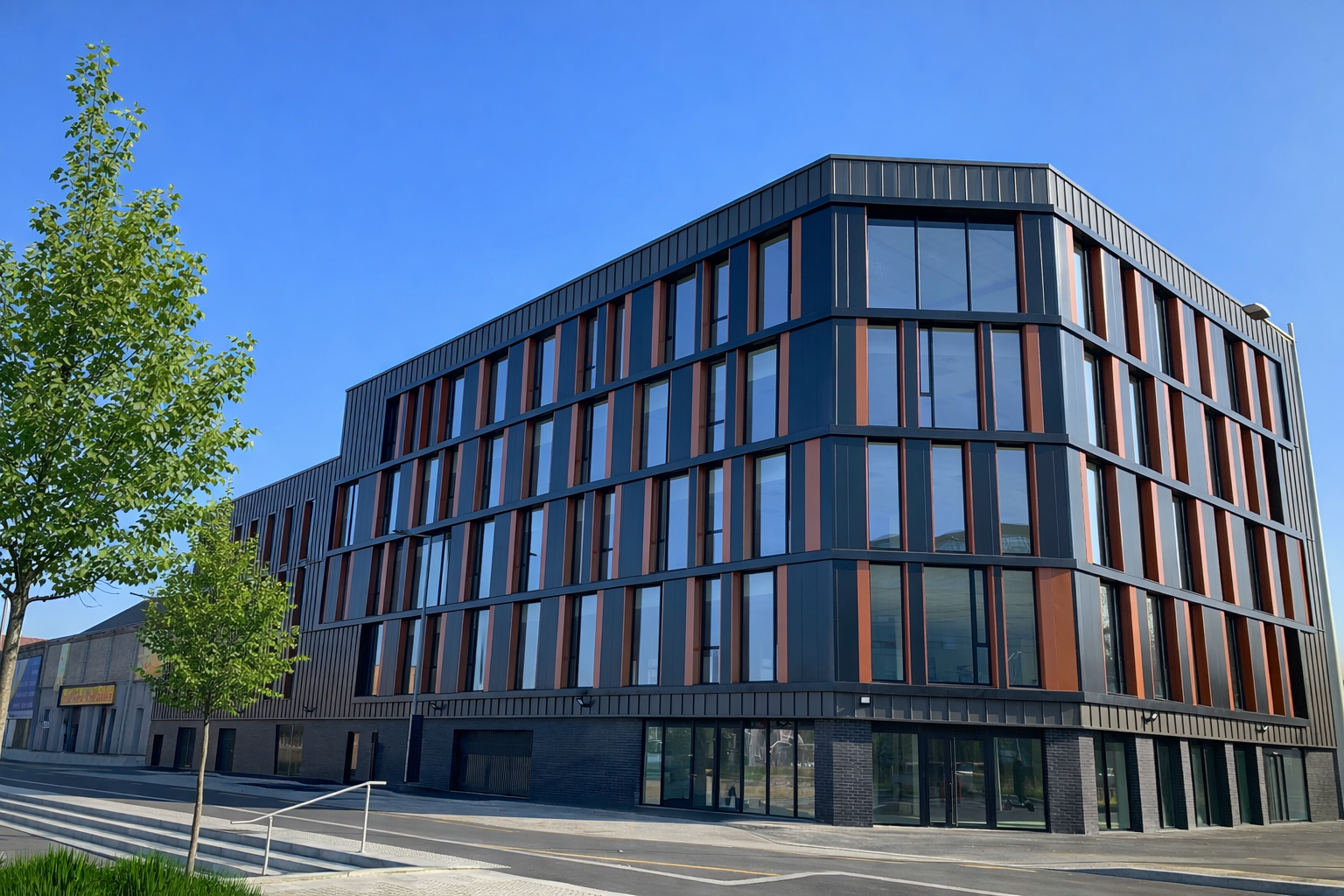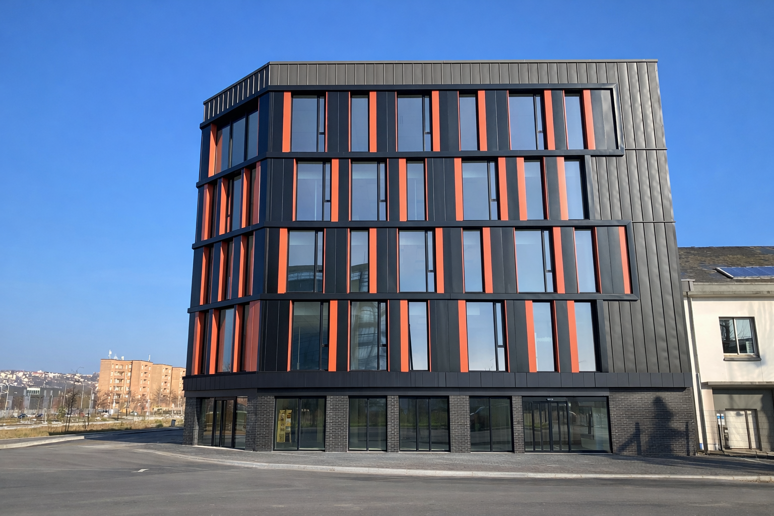 L’architecture repose sur une structure poteaux–poutres et un exosquelette en béton, affirmant une écriture solide et contemporaine. Le socle en brique noire, clin d’œil aux bâtiments industriels historiques du secteur, assoit le bâtiment dans son contexte. Au-dessus, les façades jouent sur une alternance de bardages lisses noirs et ocre rouge, de panneaux à joint debout gris fumé, et de larges surfaces vitrées qui captent la lumière et animent le bâtiment d’une vibration changeante au fil de la journée.