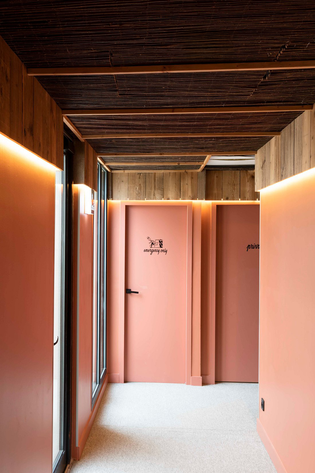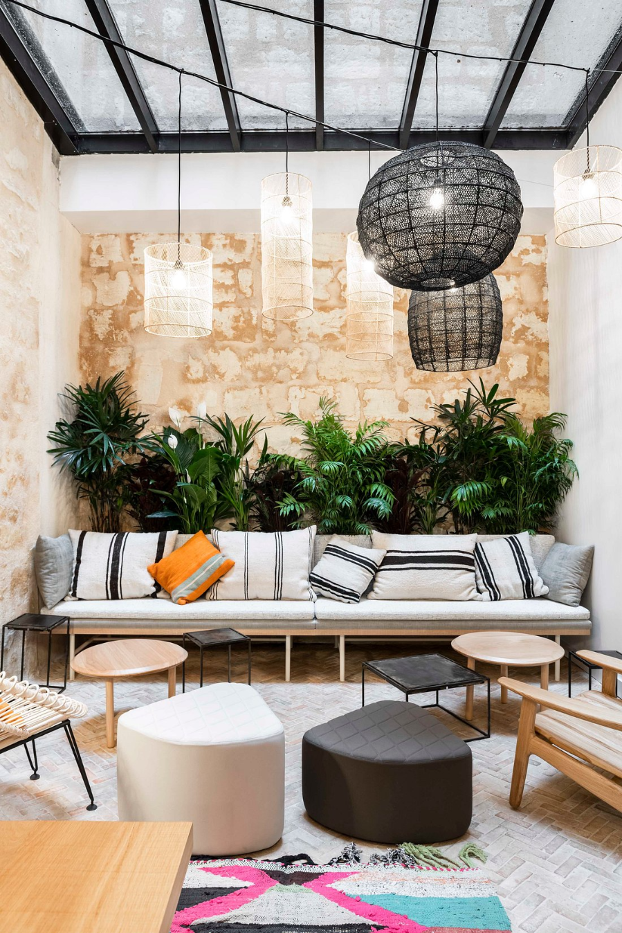 Les matériaux bruts, les couleurs naturelles et les luminaires sur mesure composent un décor chaleureux et contemporain, où l’ambiance industrielle du bâtiment dialogue avec une esthétique urbaine douce et accueillante.