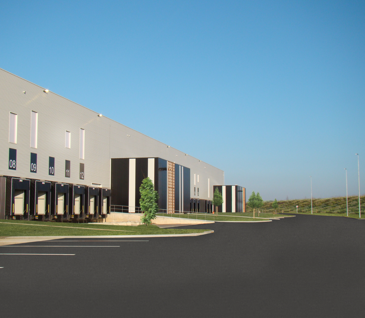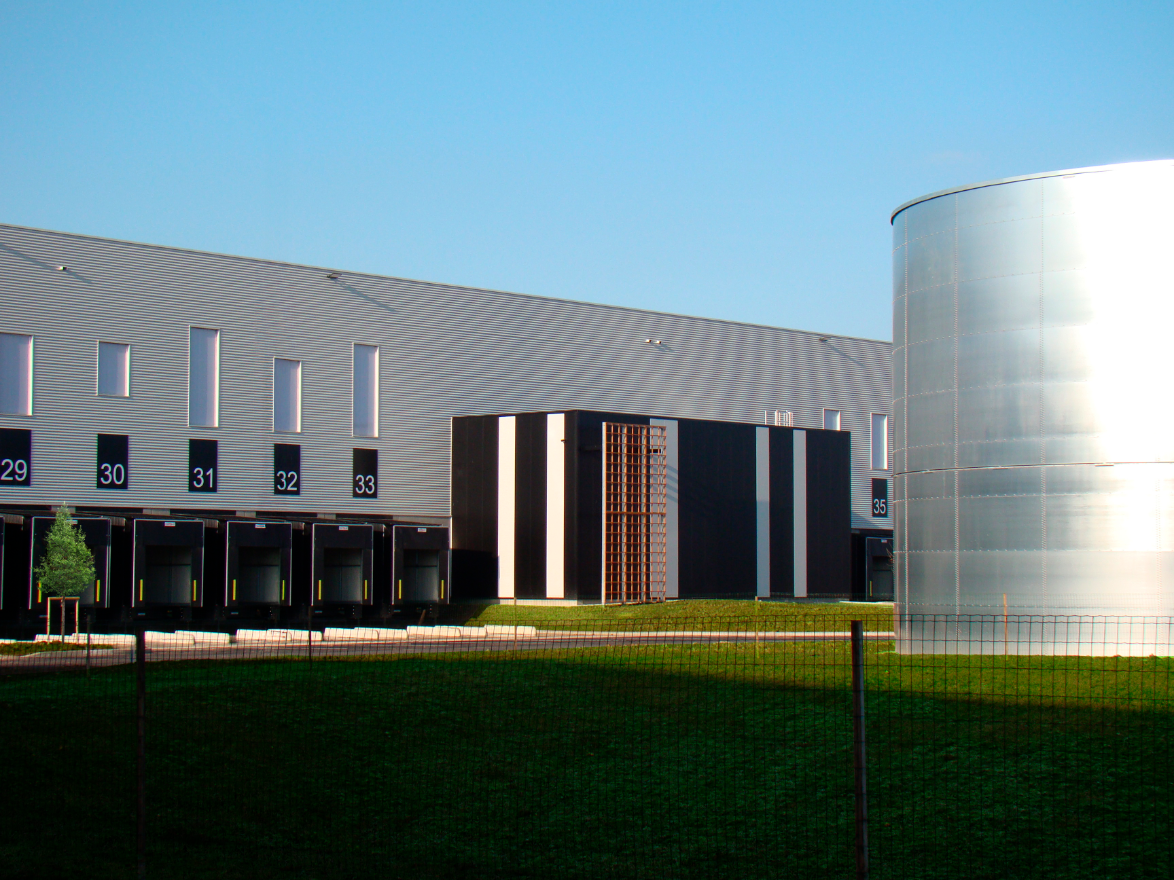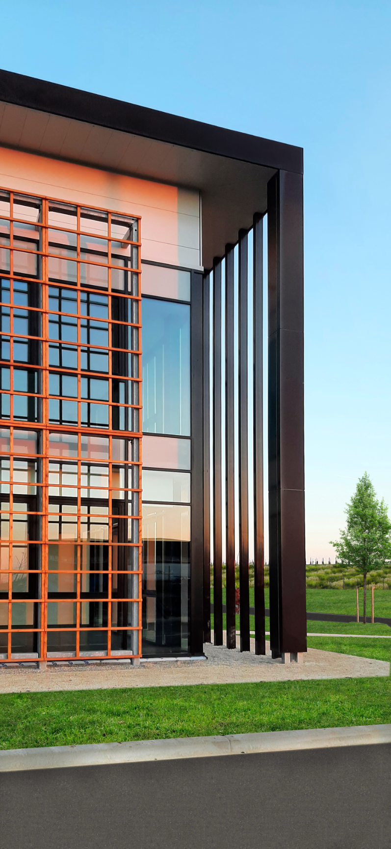 Le bâtiment à cellules dos à dos offre une modularité optimale, chaque cellule disposant de ses propres quais de chargement pour garantir une flexibilité logistique et une gestion des flux performante. Son architecture contemporaine privilégie une sobriété expressive : façades vitrées, habillages en panneaux bois perforés, socle en béton brut et jeux d’ombres qui structurent la volumétrie tout en affirmant une présence sobre et maîtrisée dans le paysage.