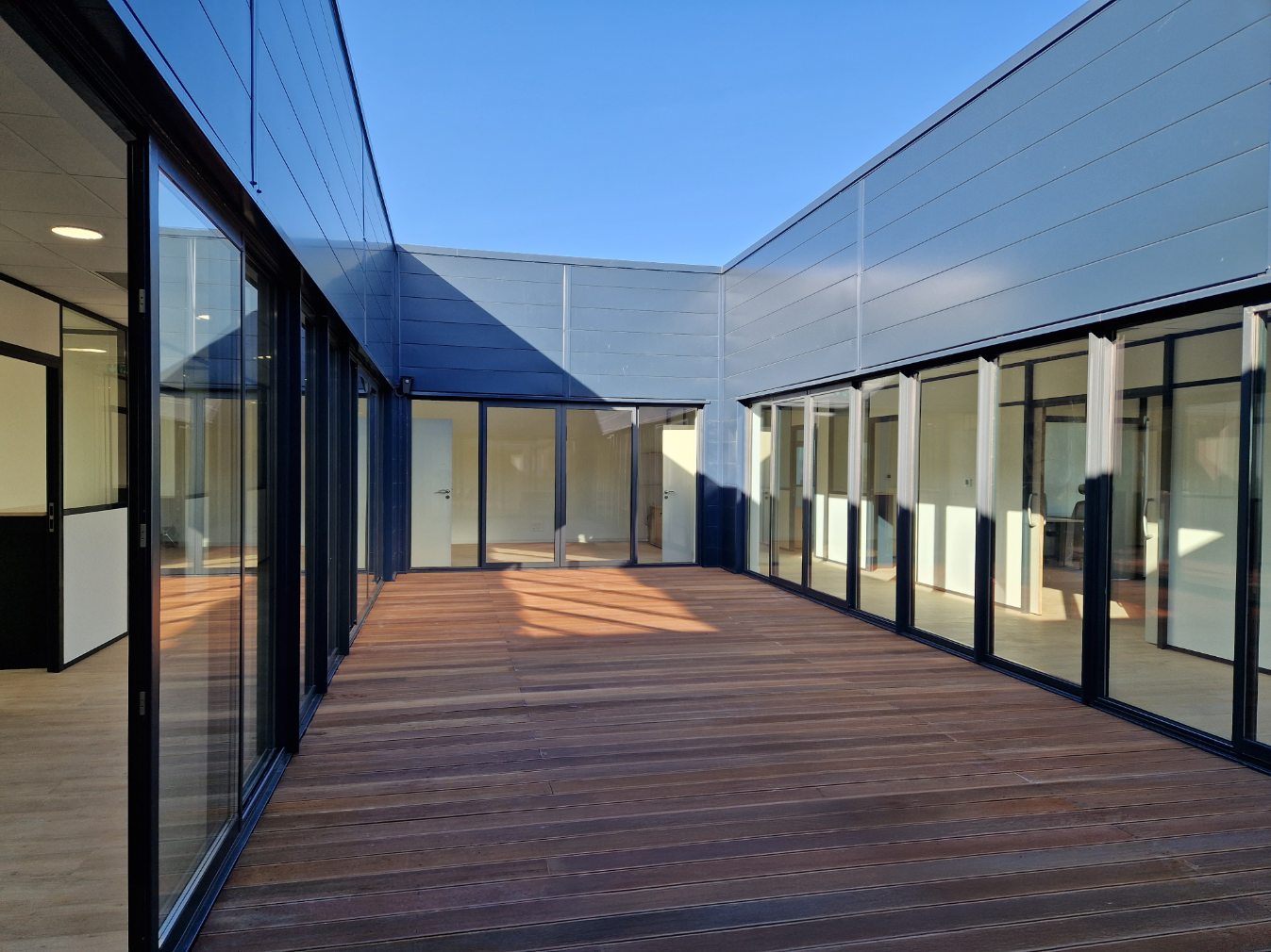 Le projet comprend également des toitures-terrasses accueillant une installation photovoltaïque, renforçant la performance énergétique du site et inscrivant le bâtiment dans une démarche durable et responsable.