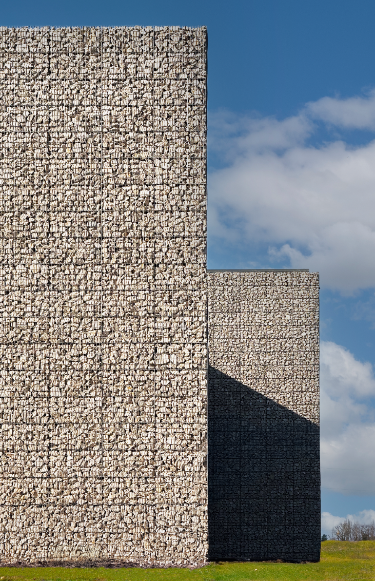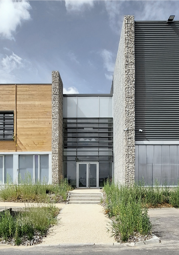 Les façades associent bois de Mélèze, gabions de pierre, bardage métallique et panneaux polycarbonate translucides, jouant sur les matières, la lumière et le rythme des volumes. La végétation grimpante renforce la dimension vivante et évolutive du projet, tandis que les toitures végétalisées accueillent des panneaux photovoltaïques couvrant 30 % de la surface, contribuant à l’autonomie énergétique du site.