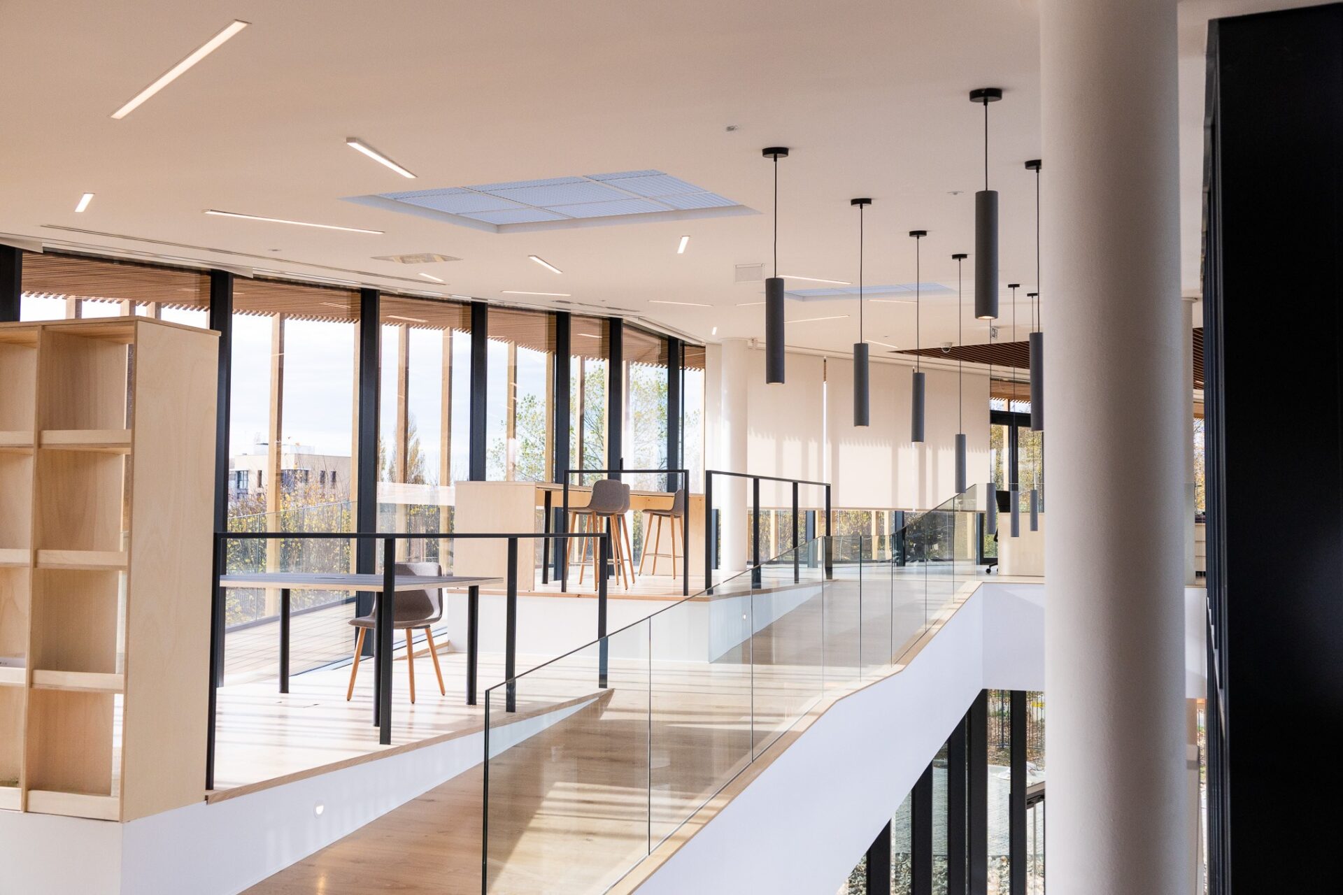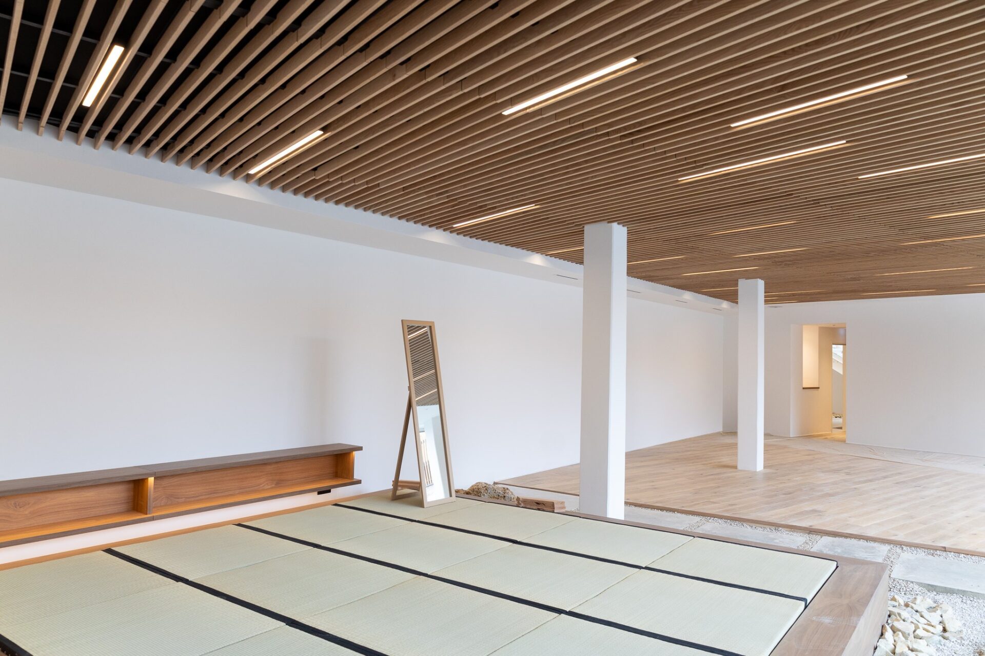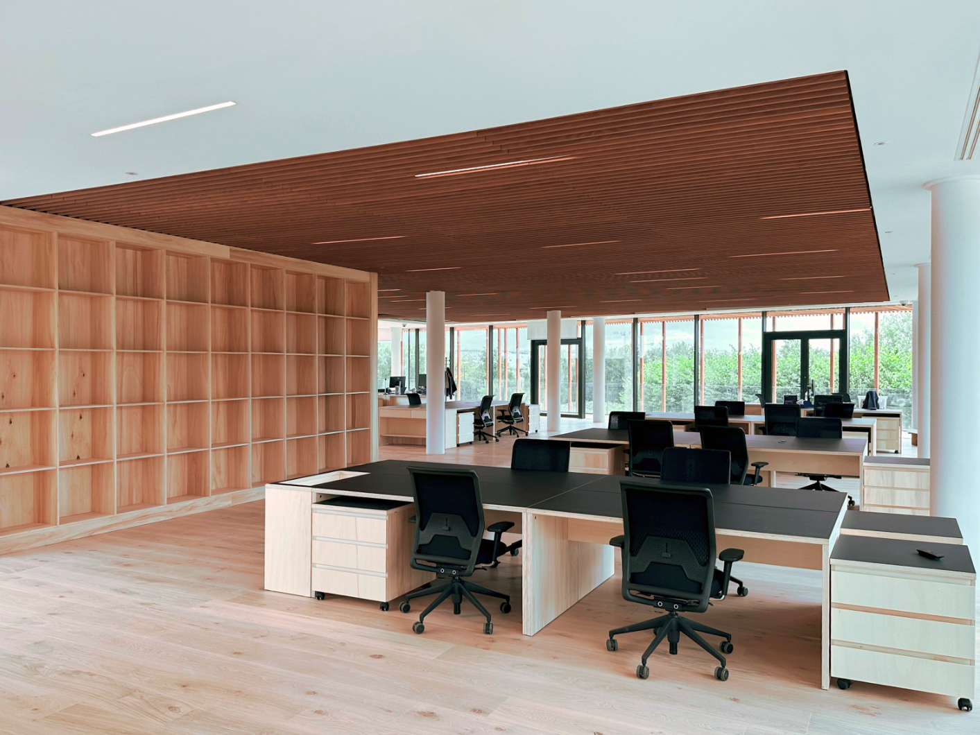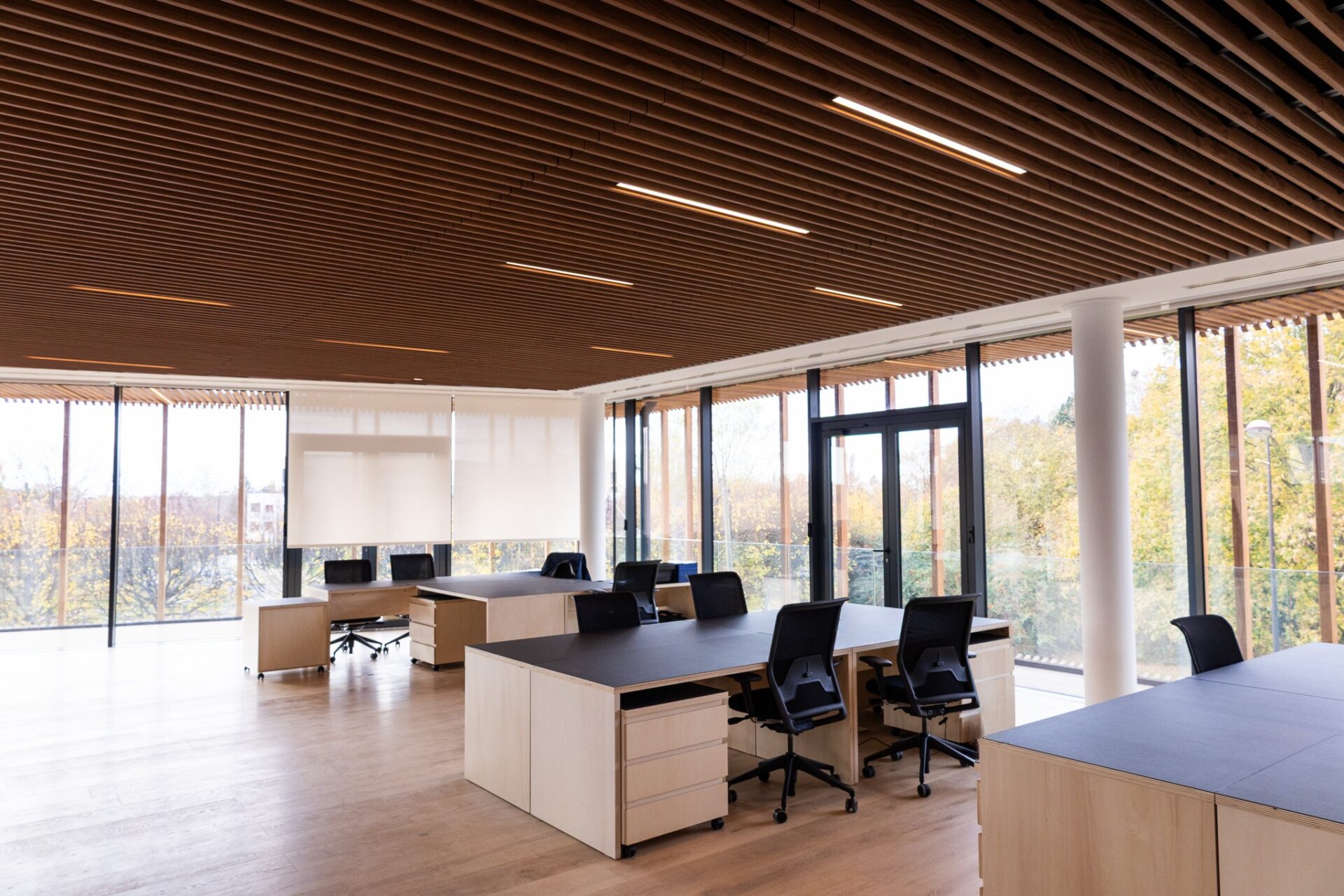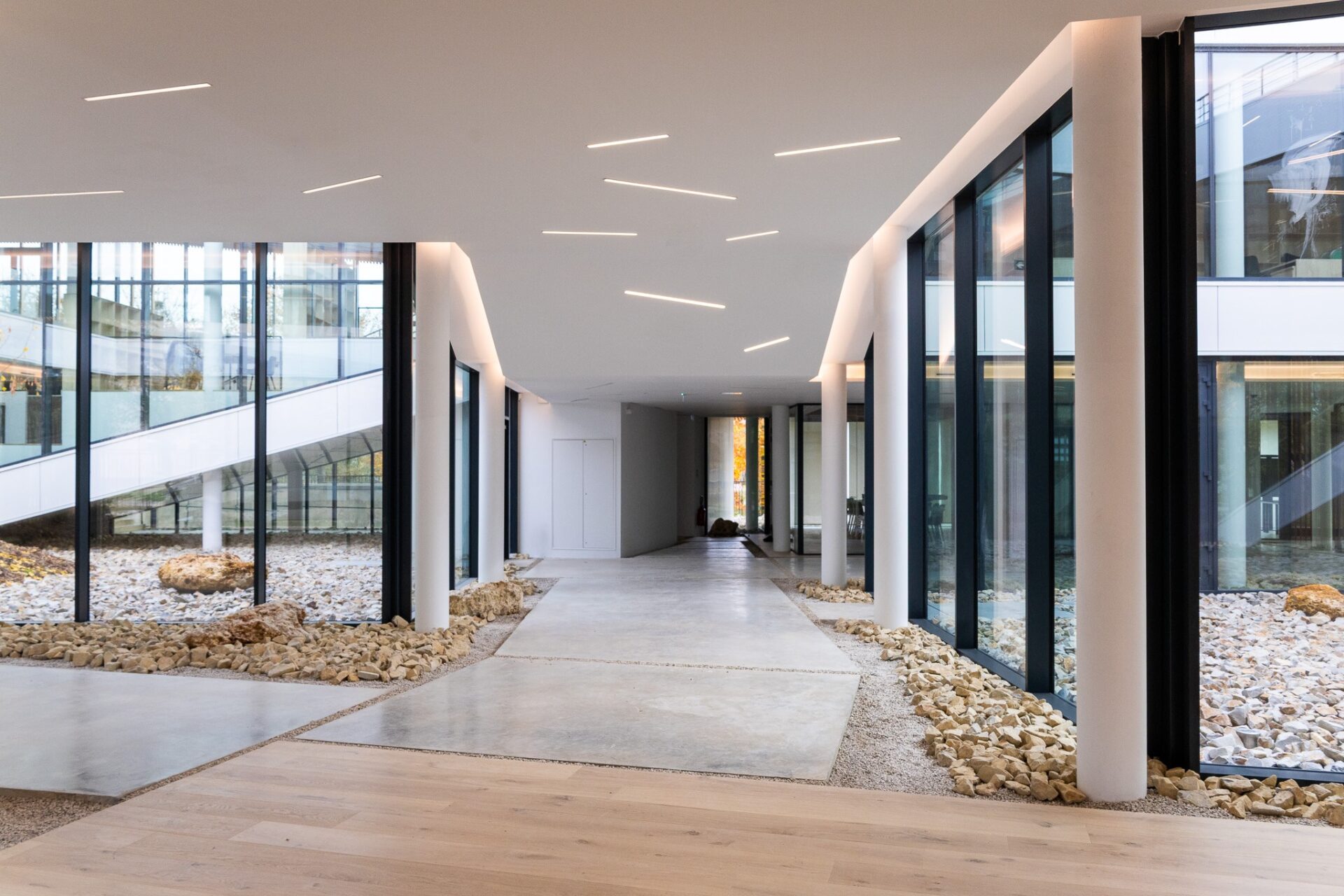 Les aménagements intérieurs constituent l’une des signatures majeures du projet. Les espaces de travail s’ouvrent largement sur les patios et bénéficient d’une lumière douce filtrée par un plafond en lames bois. Le choix des matériaux, bois clair, pierre, enduits naturels, crée une ambiance chaleureuse et apaisée, fidèle à l’esthétique japonaise contemporaine.