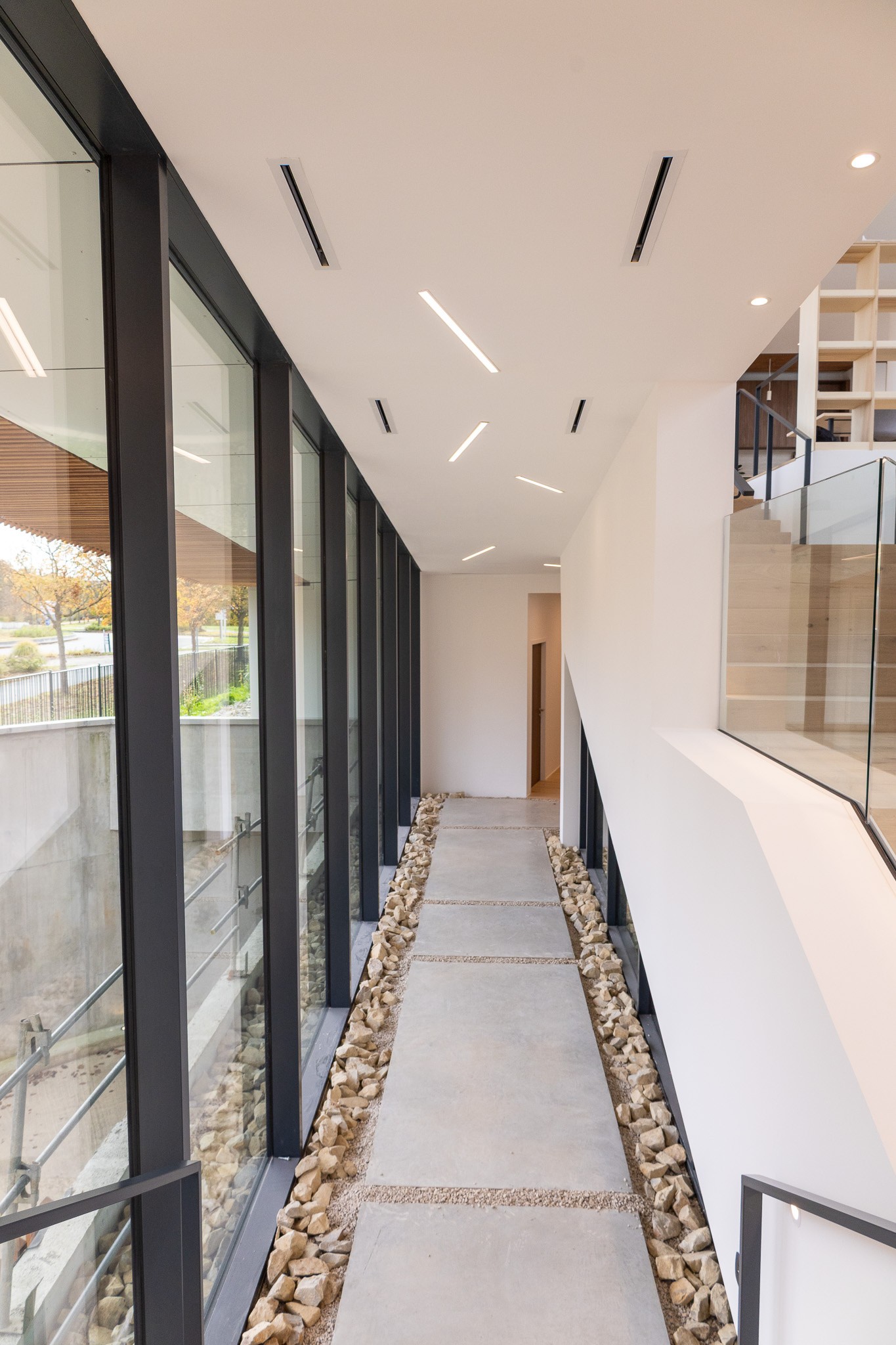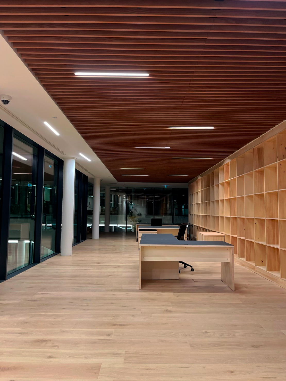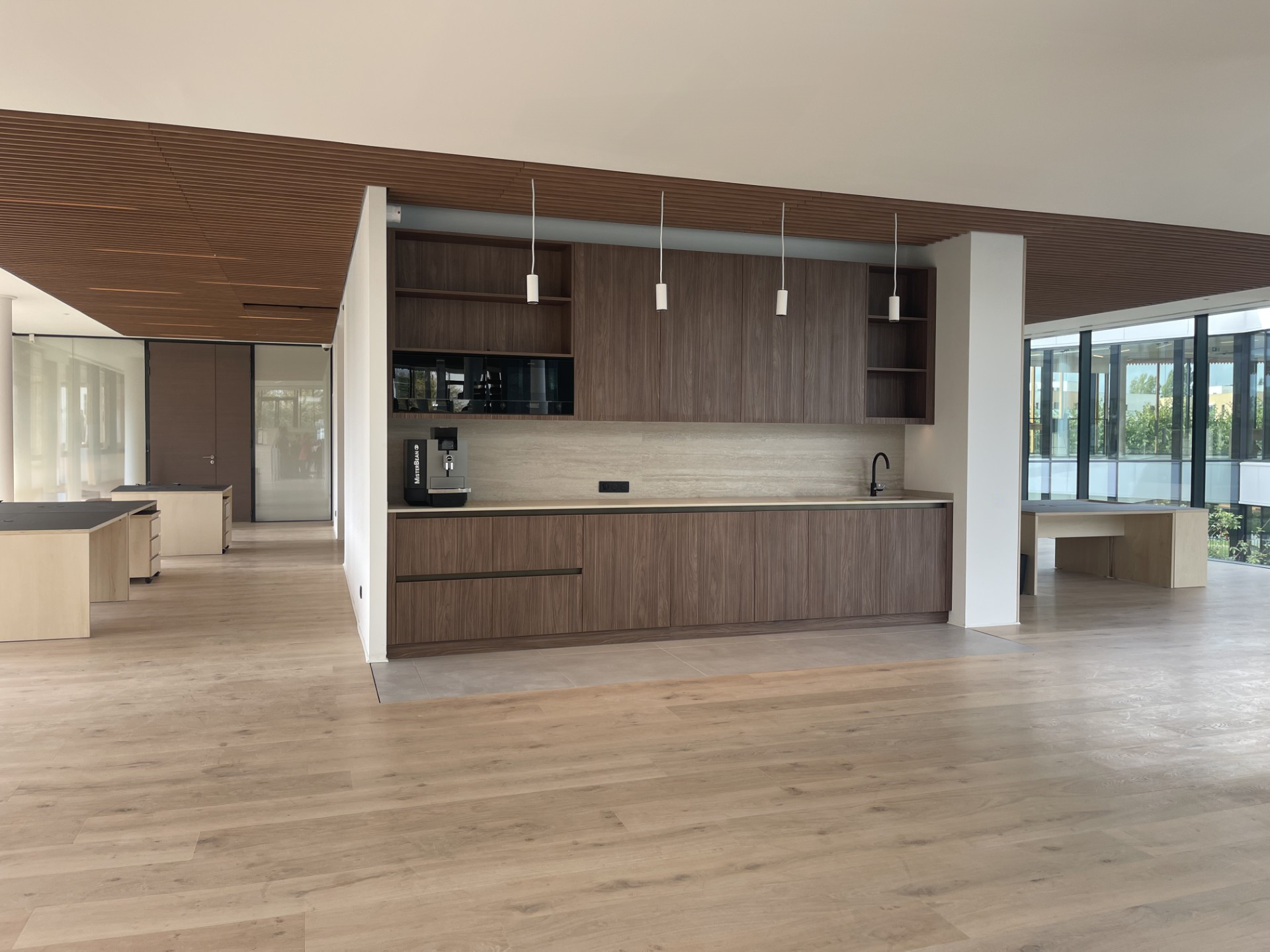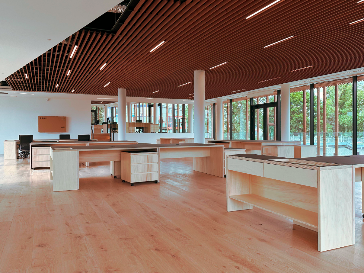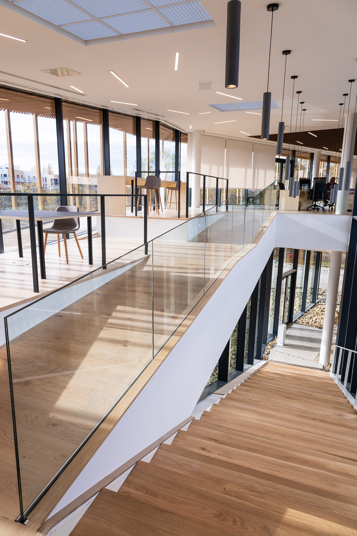 Les aménagements intérieurs constituent l’une des signatures majeures du projet. Les espaces de travail s’ouvrent largement sur les patios et bénéficient d’une lumière douce filtrée par un plafond en lames bois. Le choix des matériaux, bois clair, pierre, enduits naturels, crée une ambiance chaleureuse et apaisée, fidèle à l’esthétique japonaise contemporaine.