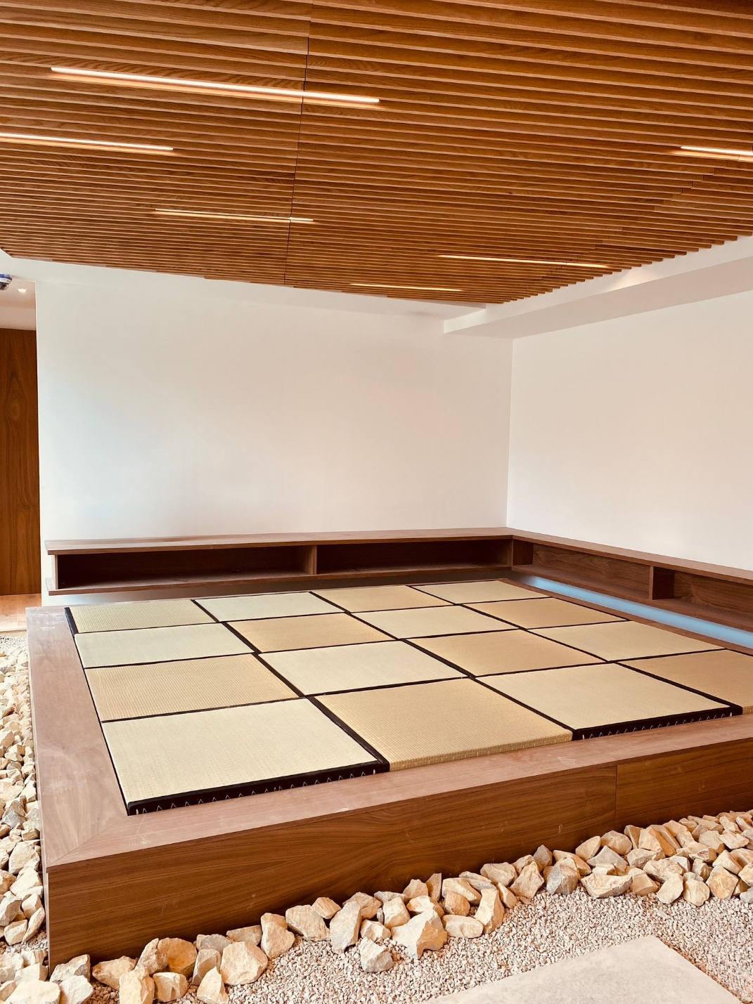 Au cœur de l’un des niveaux, un espace dédié au tatami constitue un lieu central et identitaire. Installé sur un socle en bois entouré de pierres naturelles, il adopte un calepinage rigoureux inspiré des proportions traditionnelles japonaises. Ce lieu devient un espace de rencontre, de quietude et de pratique collective, incarnant l’esprit d’équilibre et de retenue qui caractérise l’ensemble du projet.