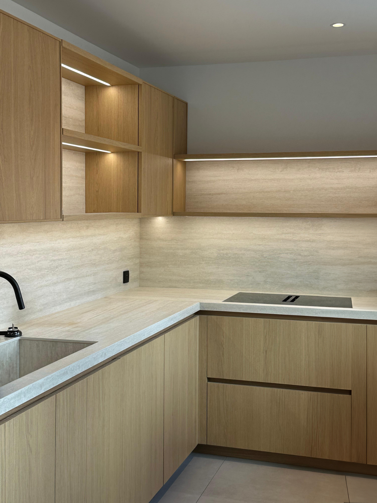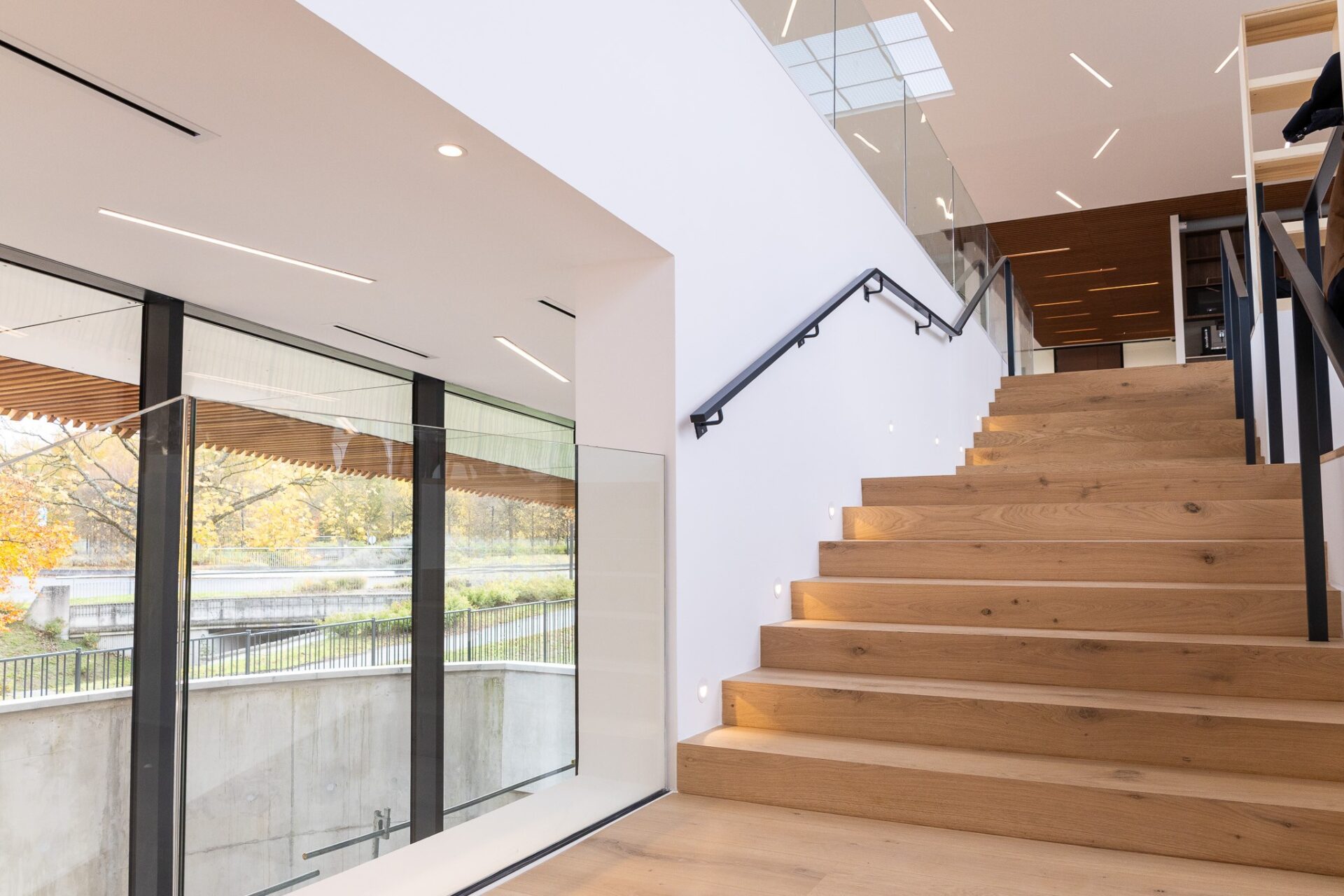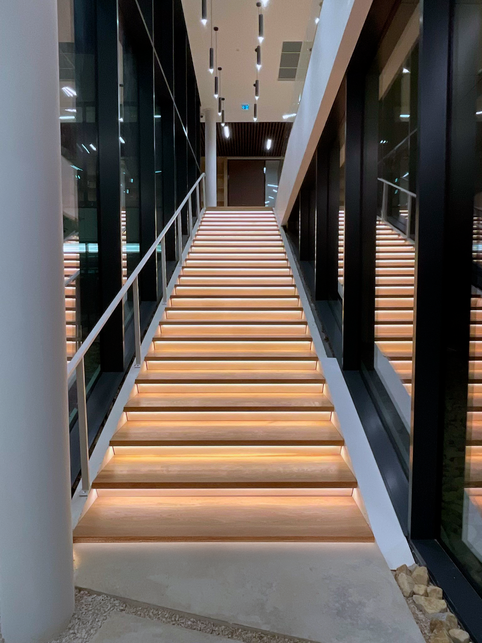 Les espaces de détente, les zones de convivialité et la grande cuisine ouverte prolongent cette attention au confort et à la simplicité. Les parcours internes sont ponctués d’éléments architecturaux marquants, comme l’escalier principal aux marches rétroéclairées, véritable colonne vertébrale visuelle du bâtiment.