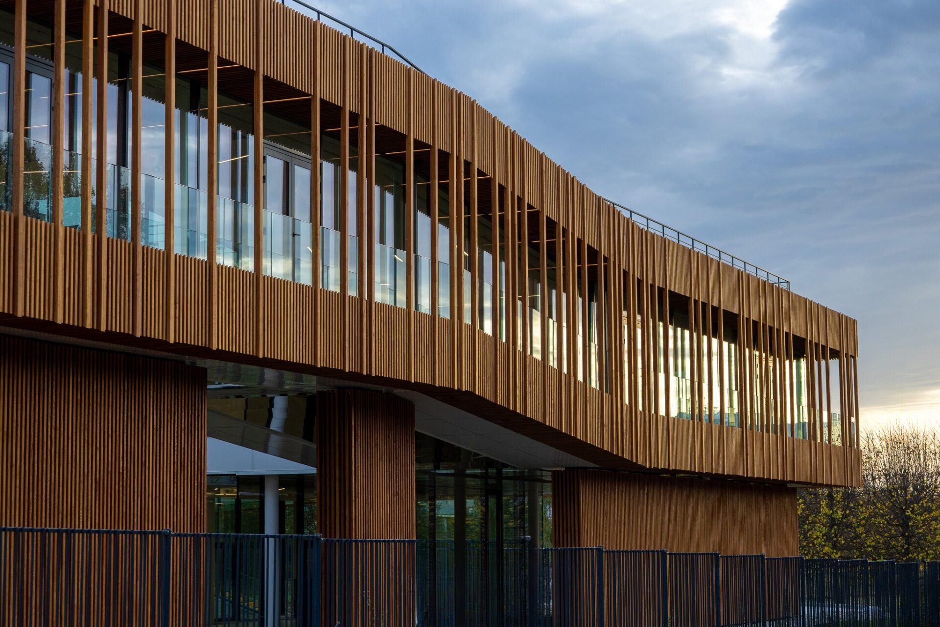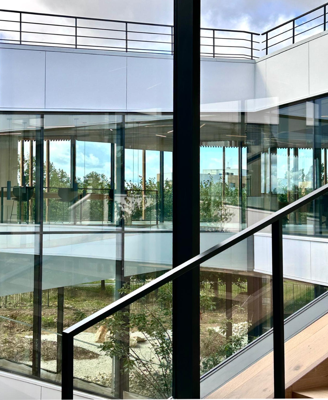 Organisé autour de trois patios végétalisés et d’une cours anglaise traitée comme un jardin zen, le bâtiment compose un environnement où les jeux d’ombre et de transparence créent une atmosphère calme et contemplative. Les filtres boisés qui enveloppent les façades prolongent ce rapport à la nature et structurent la perception du bâtiment.