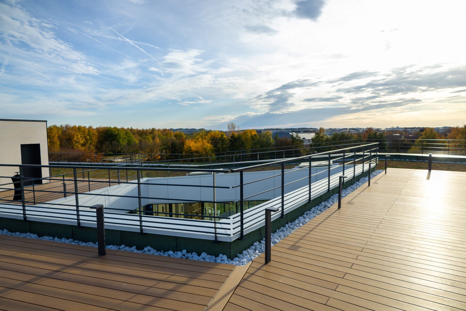 À l’extérieur, les terrasses filantes bordées de poteaux en bois prolongent l’expérience intérieure. Elles offrent un cheminement contemplatif où la lumière et le paysage deviennent des éléments de projet à part entière.