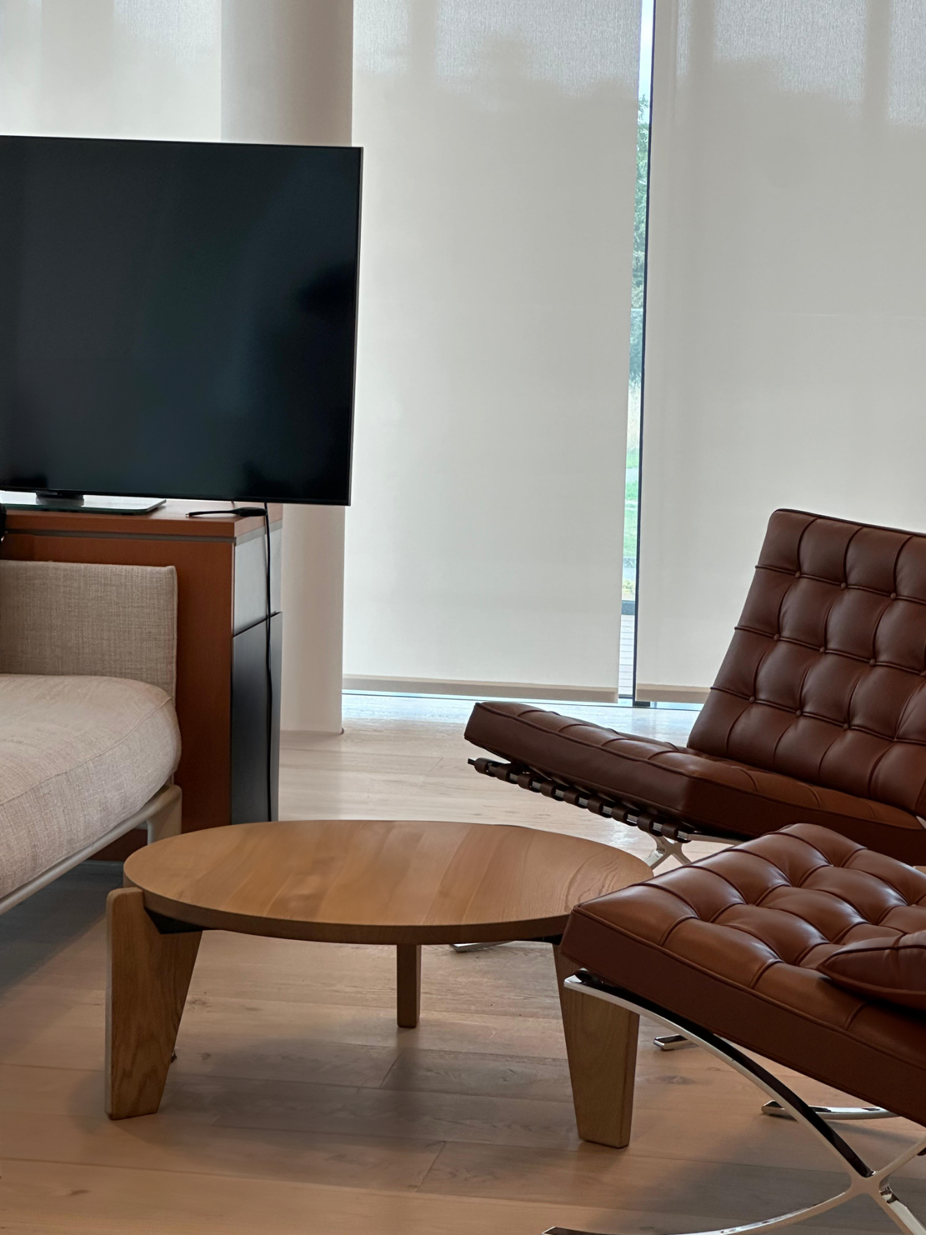 Les transparences qui rythment les circulations rappellent les cloisons légères des shoji, tout en offrant une lecture fluide des espaces. Le mobilier, sélectionné pour la sobriété de ses lignes et la qualité de ses matières, participe à l’harmonie d’ensemble : canapés aux teintes neutres, assises en cuir, tables en bois massif, surfaces aux nuances naturelles.