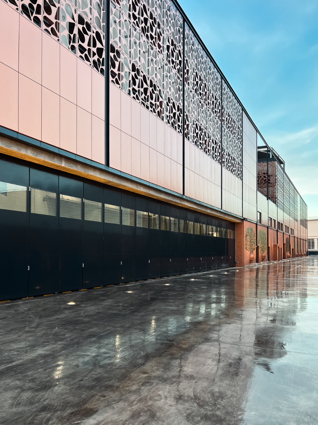 Développé sur cinq niveaux, le bâtiment se compose de deux volumes imbriqués. L’un d’eux est marqué par une large vitrine assurant la connexion visuelle et fonctionnelle entre les commerces et les deux niveaux de parkings en superstructure. Le second volume, implanté en retrait du mail, fait écho à l’histoire industrielle du site par l’emploi de briquettes moulées main, aux teintes rouge-orangé sablé.