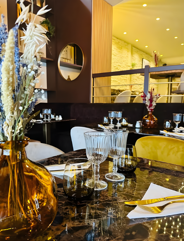 L’architecture intérieure a été pensée comme une véritable expérience sensorielle. Dès l’entrée, le lieu affirme son identité : une ambiance élégante, chaleureuse et contemporaine, où chaque détail participe à créer un cadre à la fois raffiné et convivial.
