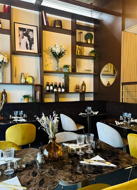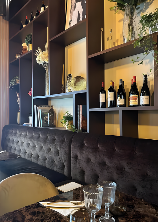 Les murs habillés de pierre claire et les claustras bois structurent les espaces tout en préservant une fluidité des circulations. Les bibliothèques murales, ponctuées de bouteilles, d’objets décoratifs et de végétation, participent à l’identité du lieu : un restaurant à l’esprit maison, élégant mais accessible.